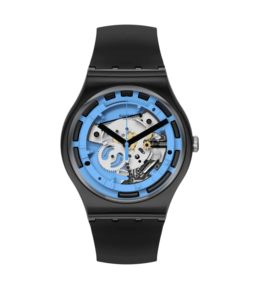 Le modèle BLUE ANATOMY (SUOB187) présente un cadran orné d'un décor imprimé bleu qui plane au-dessus d'un mécanisme argenté apparent, créant un contraste subtil avec le boîtier et le bracelet noirs.