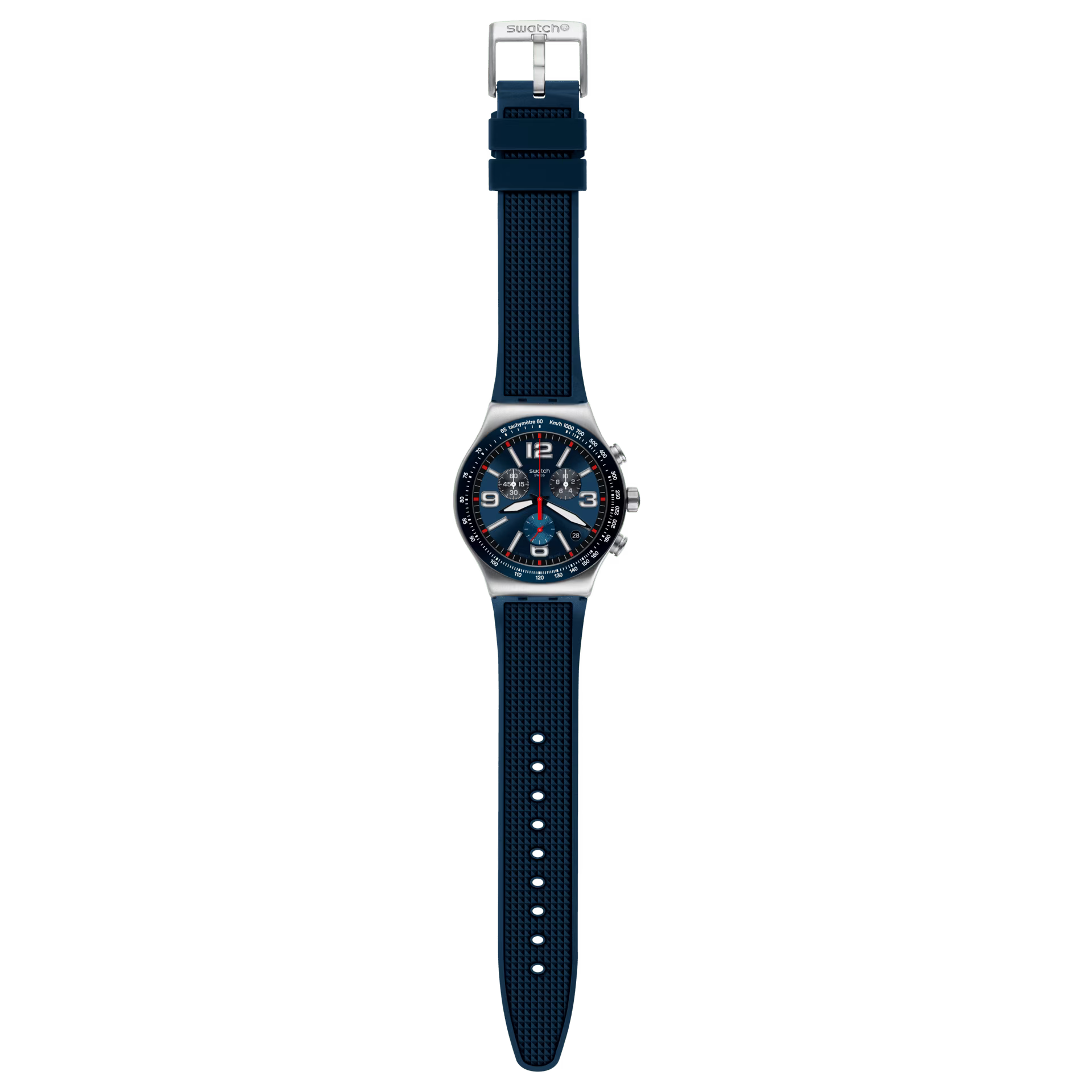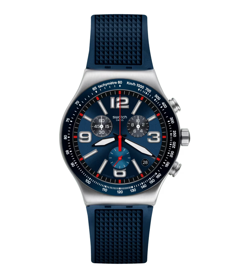 Plongez dans l'univers vibrant de la Blue Grid (YVS454), une chronographe au bleu éclatant, munie d'un bracelet en caoutchouc texturé et d'un cadran fonctionnel assorti, agrémenté d'appliqués Swatch argentés.