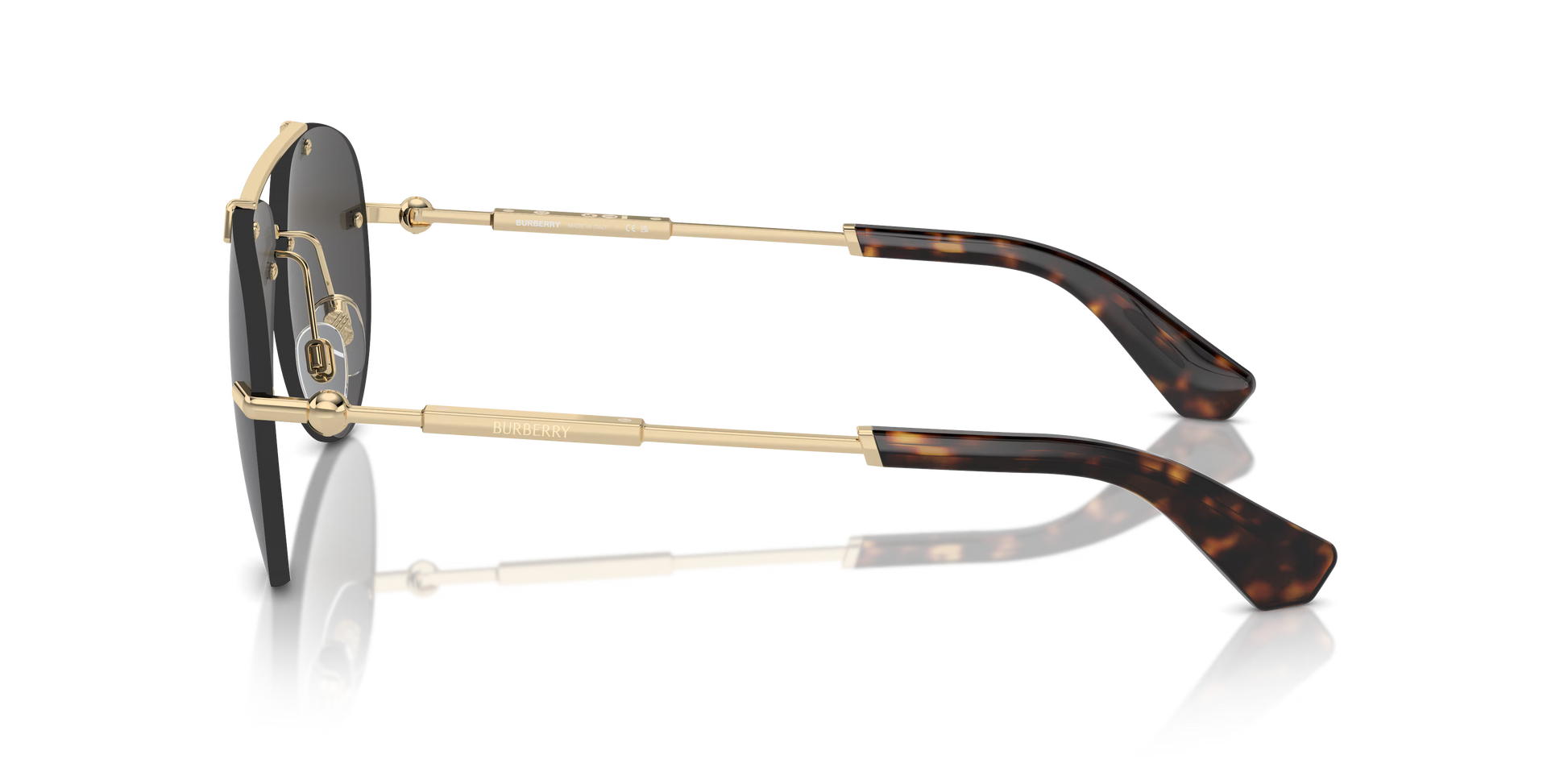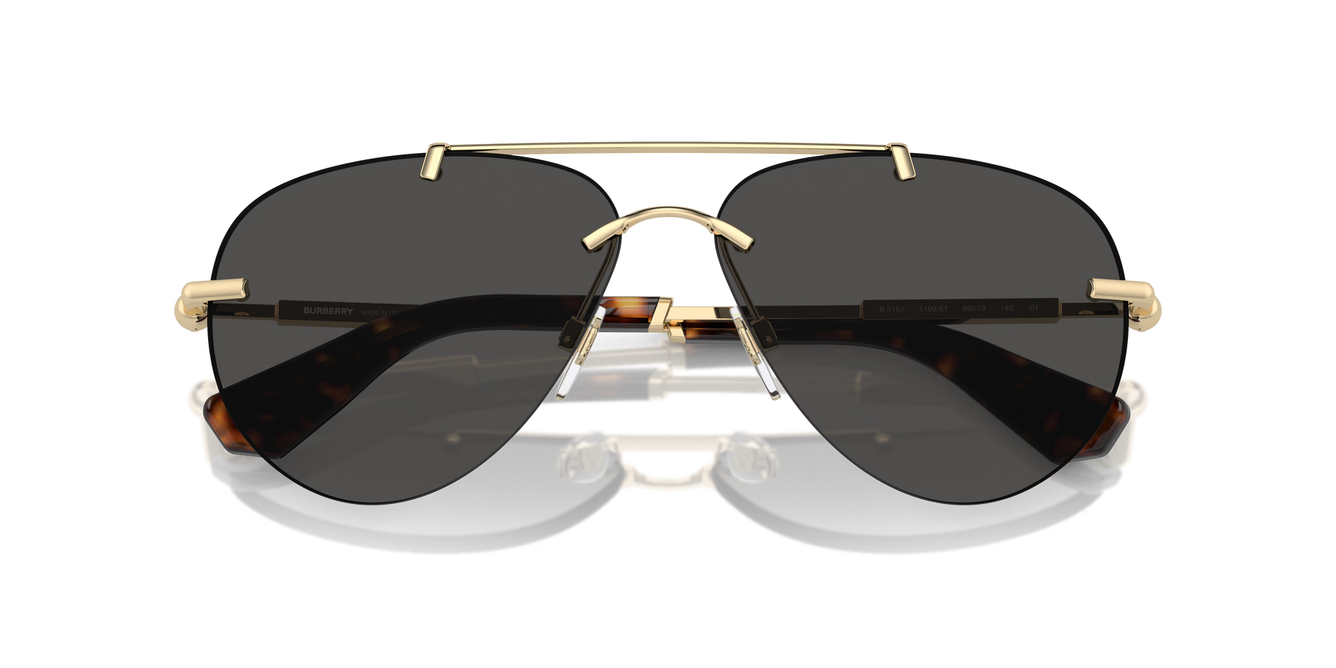 Les lunettes de soleil Burberry BE3151 rehaussent le style classique des montures pilote avec une touche moderne et élégante. La monture en métal doré clair offre une allure luxueuse, tandis que les verres gris foncé ajoutent une sophistication discrète.