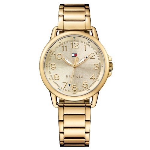 Donnez une allure moderne à votre poignet en portant cette montre analogique pour femmes de Tommy Hilfiger. Fonctionnant avec un mouvement à quartz, le cadran rond doré champagne présente simplement trois aiguilles, des marques numériques toutes les cinq minutes et une couronne pour régler l'heure. Le bracelet en métal dégage une teinte dorée qui accentue l'apparence de la montre. De plus, il est équipé d'une boucle à bouton-poussoir pour assurer un ajustement sécurisé sur le poignet.