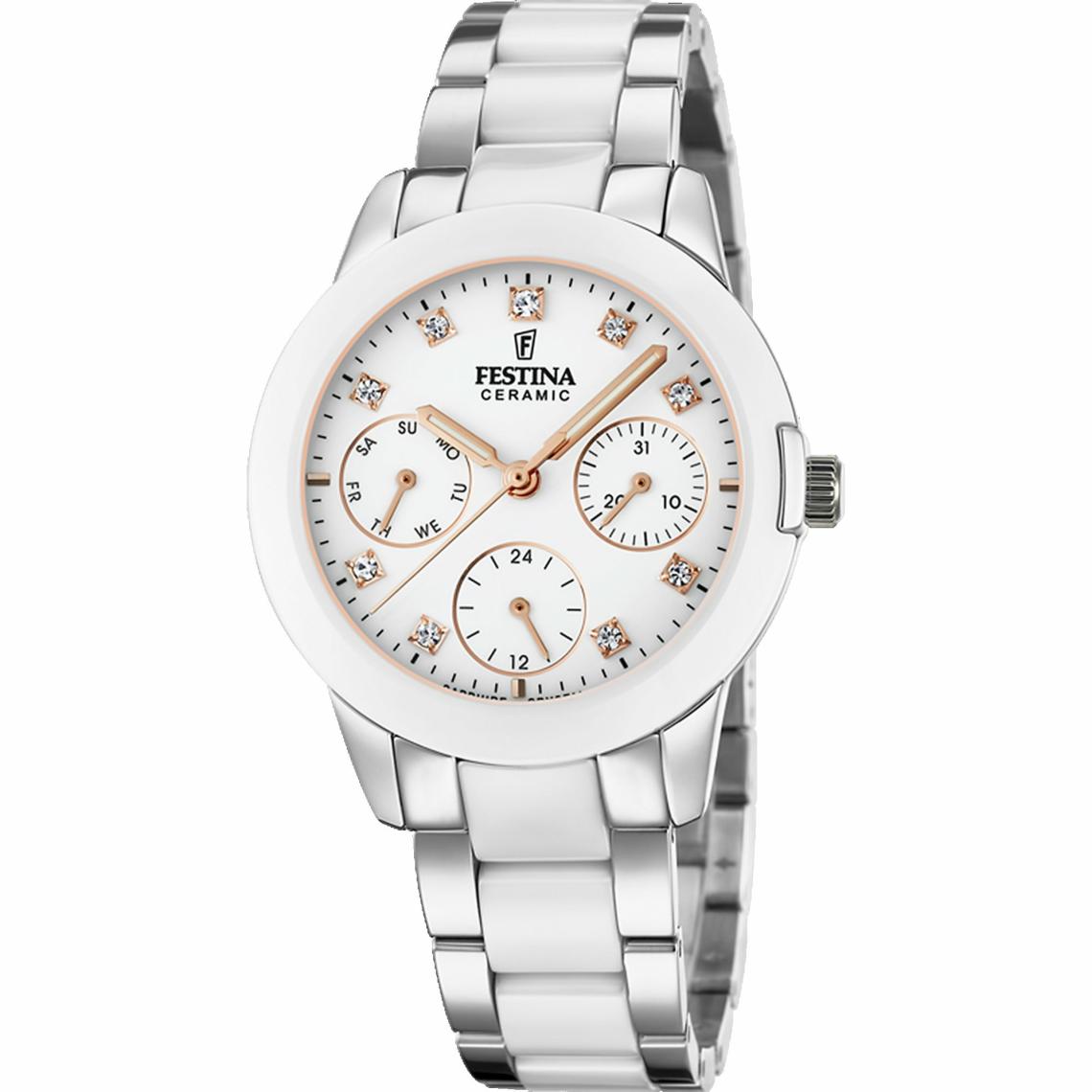 La montre CERAMIC de Festina est une montre pour femme qui se distingue par son boîtier en céramique noir poli et son bracelet en céramique également noir. Le boîtier de 36 mm de diamètre est doté d'un cadran noir avec des index bâtons et des aiguilles lumineuses argentées. Le cadran est protégé par un verre minéral résistant aux rayures. La montre est également équipée d'une fonction de date à 3 heures.