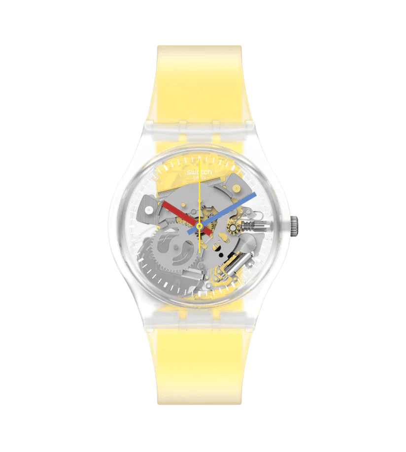 Cette montre possède un boîtier en plastique transparent dont l'imprimé jaune au dos est assorti au bracelet en silicone. Le cadran transparent affiche des index blancs et des aiguilles rouges, bleues et jaunes.