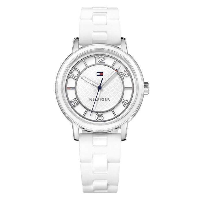 Cette montre analogique pour femme de la collection Nina de la marque Tommy Hilfiger, modèle 1781667, est garantie 2 ans et possède un mouvement à pile avec une résistance à l'eau de 30M/3ATM, un cristal minéral et une couleur blanche, le tout pesant 47 g.