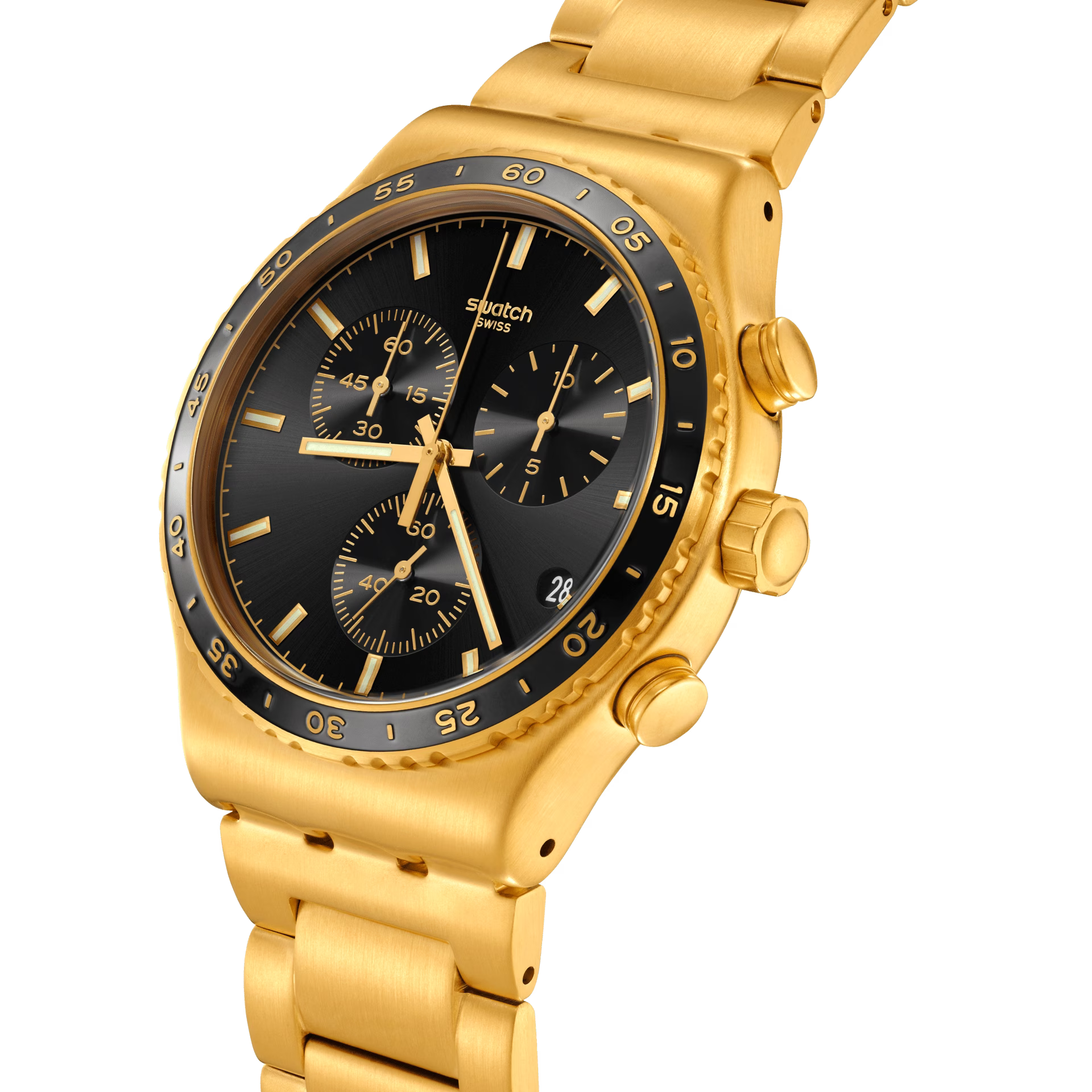 Le chronographe "In the Black" présente un cadran noir brossé soleil avec des aiguilles des heures et des minutes qui brillent dans l'obscurité, ainsi que des chiffres dorés, conférant à cette montre un aspect distinctif et raffiné. Ce modèle est équipé d'un boîtier en acier PVD brossé doré, offrant une touche d'élégance supplémentaire, et d'un bracelet assorti en acier inoxydable ajustable avec une boucle papillon.