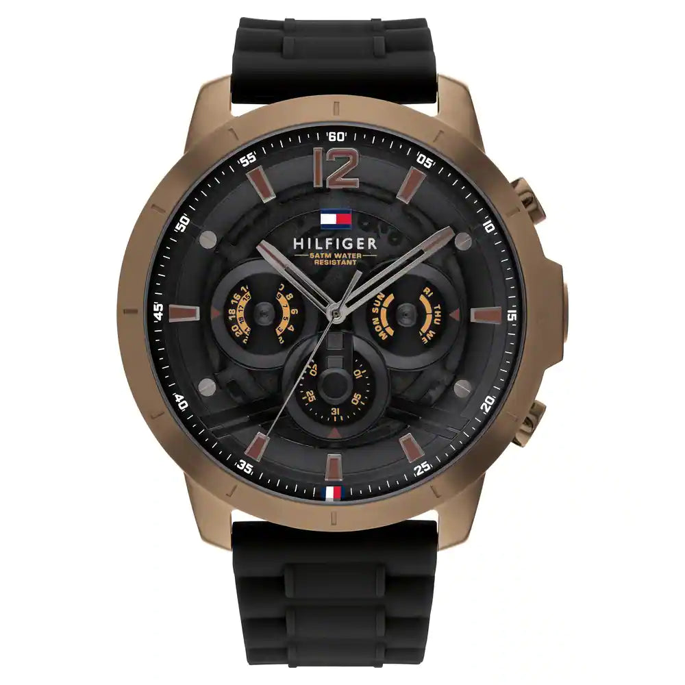 Une montre-bracelet Tommy Hilfiger pour homme élégante avec un cadran extrêmement grand. Cette montre-bracelet robuste Luca de Hilfiger est dotée d'un boîtier en acier inoxydable durable et d'un bracelet en silicone noir. Le grand cadran gris foncé de 50 mm est protégé par un verre minéral et les aiguilles et les index sont de couleur brunâtre.