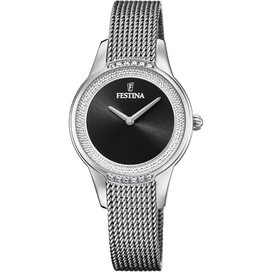 La montre est également un modèle féminin et élégant de la collection de montres pour femmes de la marque Festina. Elle dispose d'un boîtier rond en acier inoxydable de 36 mm de diamètre avec un cadran noir délicat, des index en chiffres romains, des aiguilles en acier inoxydable argenté et une fenêtre de date à 3 heures.