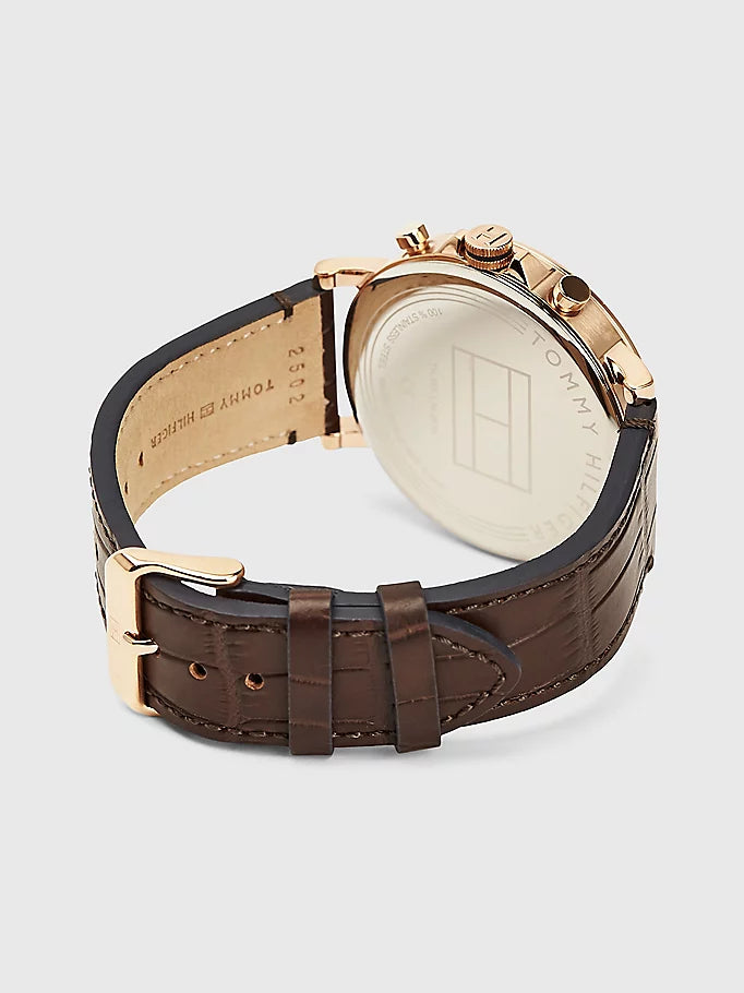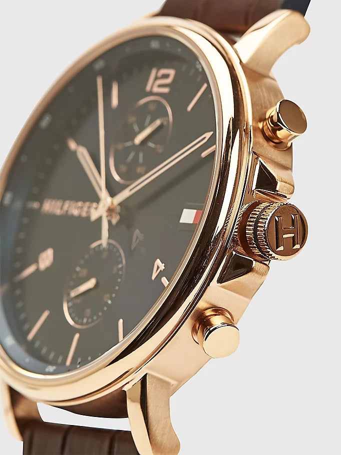 Cette montre mêle détails fonctionnels et élégance intemporelle avec ses deux sous-cadrans, son bracelet en cuir texturé et son boîtier plaqué or rose.