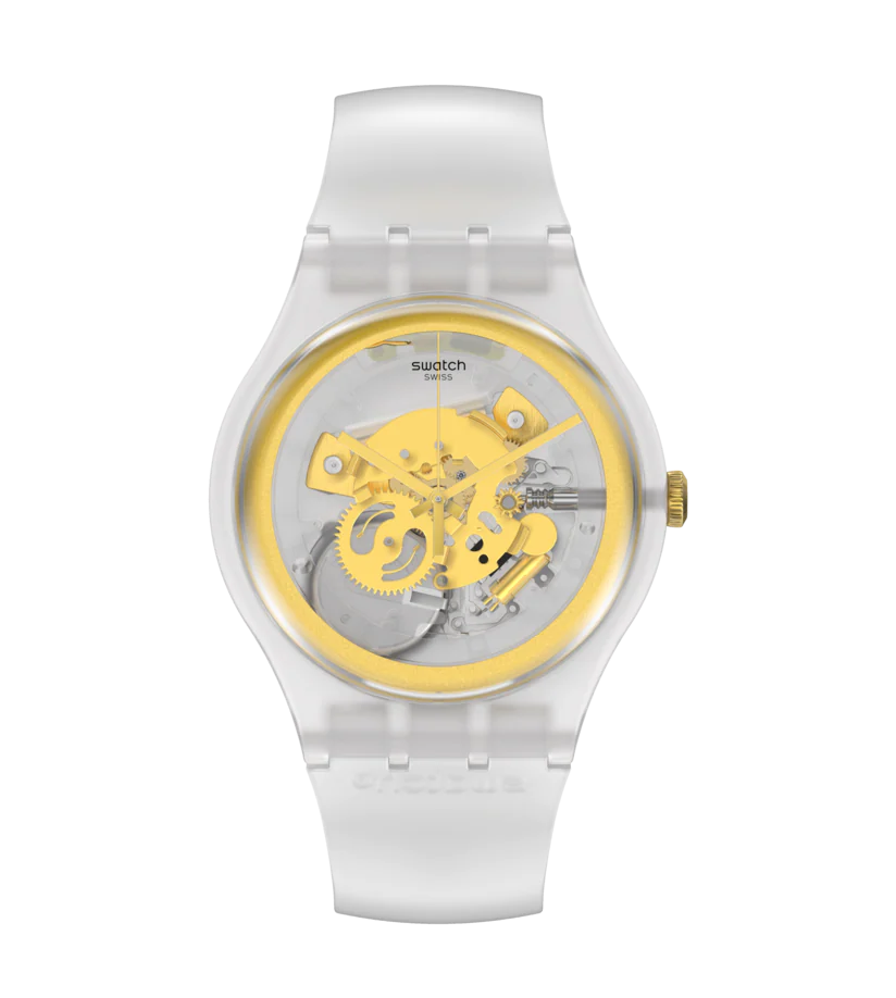 - Couleur : La montre est entièrement transparente, y compris le bracelet, le cadran et le boîtier, rendant hommage à la mythique Golden Jelly. Cette transparence symbolise l'ADN de la marque Swatch, mettant en avant les valeurs de transparence, de légèreté et de mouvement.