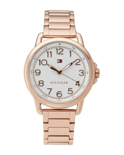 Cette montre pour dames Tommy Hilfiger modèle 1781657 a un boîtier et un bracelet en acier inoxydable couleur or rose avec un cadran blanc et or rose, une résistance à l'eau de 30 mètres, un mouvement à quartz et est livrée avec la boîte et les papiers d'origine. Elle a un style décontracté et classique avec le logo de la marque comme thème, et ne possède pas de fonction de date.
