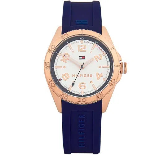 Ce modèle pour femme de Tommy Hilfiger est doté d'un chronomètre à quartz avec un boîtier rond de 36 mm, un verre en cristal minéral et une résistance de 3 ATM, fabriqué en caoutchouc.