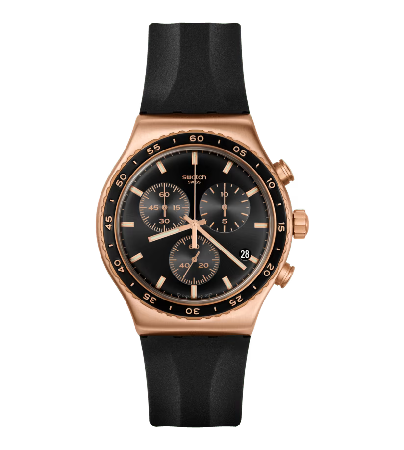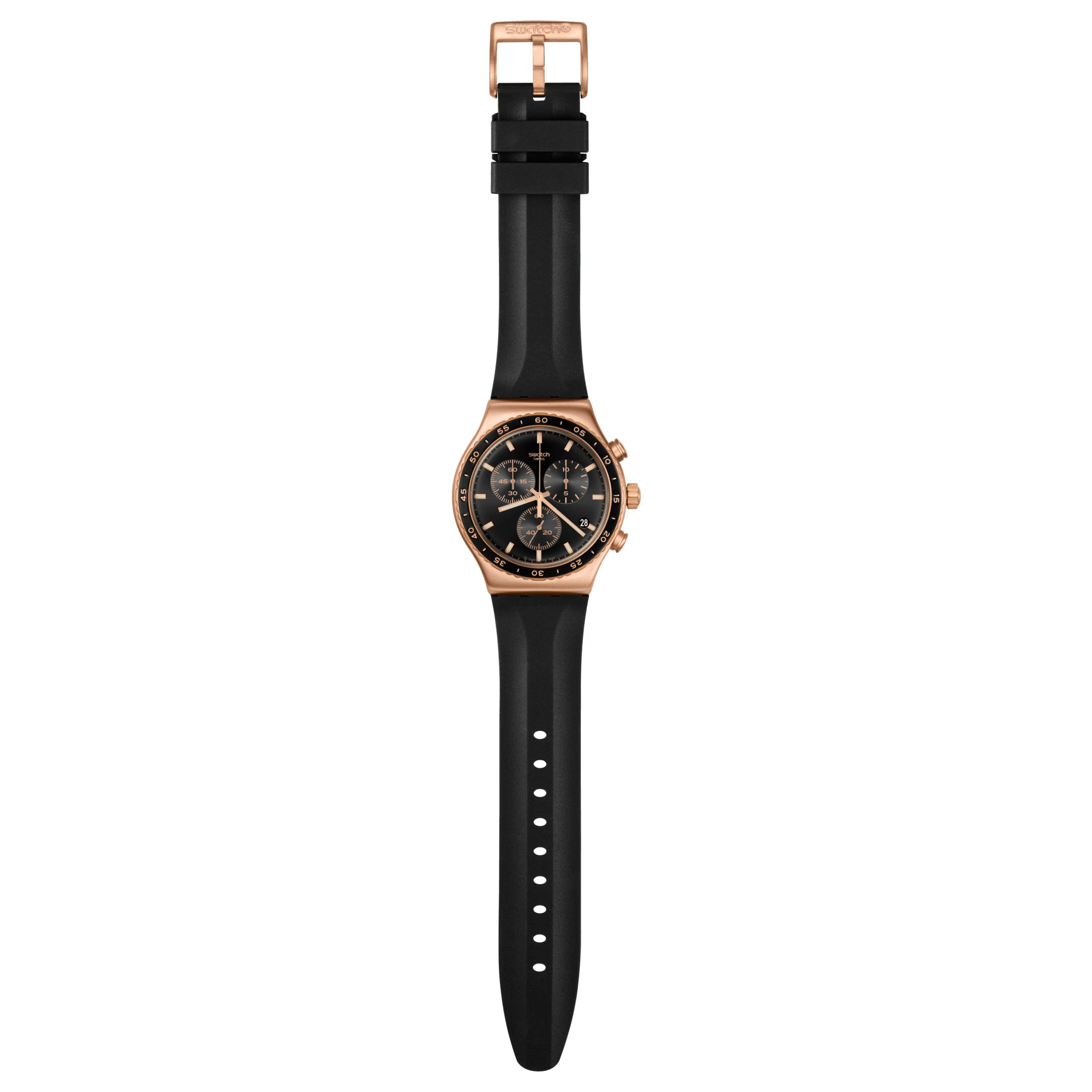 Découvrez le charme raffiné de la Stain Sheen (YVG410), un chronographe en acier inoxydable doré rose, orné d'un bracelet en caoutchouc noir et d'un boîtier en métal brossé avec une boucle assortie. Son cadran noir brossé met en valeur des index roses et des aiguilles rose doré, lumineux dans l'obscurité.