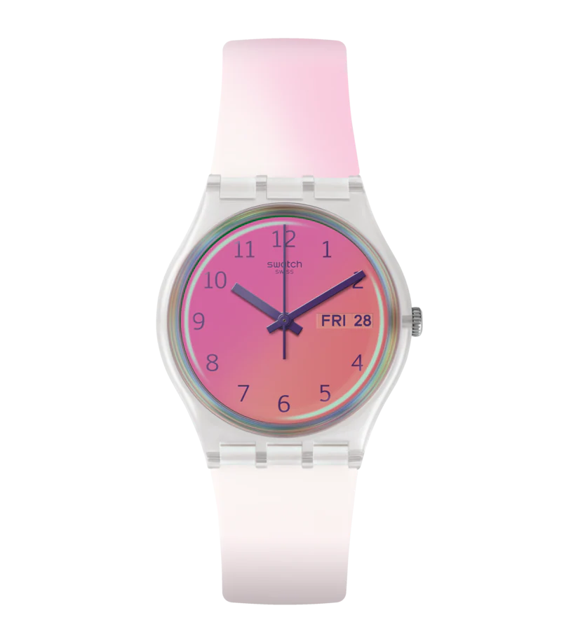 À la pointe de la mode, ULTRAFUSHIA (GE719) est parée d’un superbe verre Swatch Solar Spectrum Glass qui vient recouvrir son cadran rose. Son imprimé et ses aiguilles bleus viennent lui conférer une touche de peps supplémentaire.