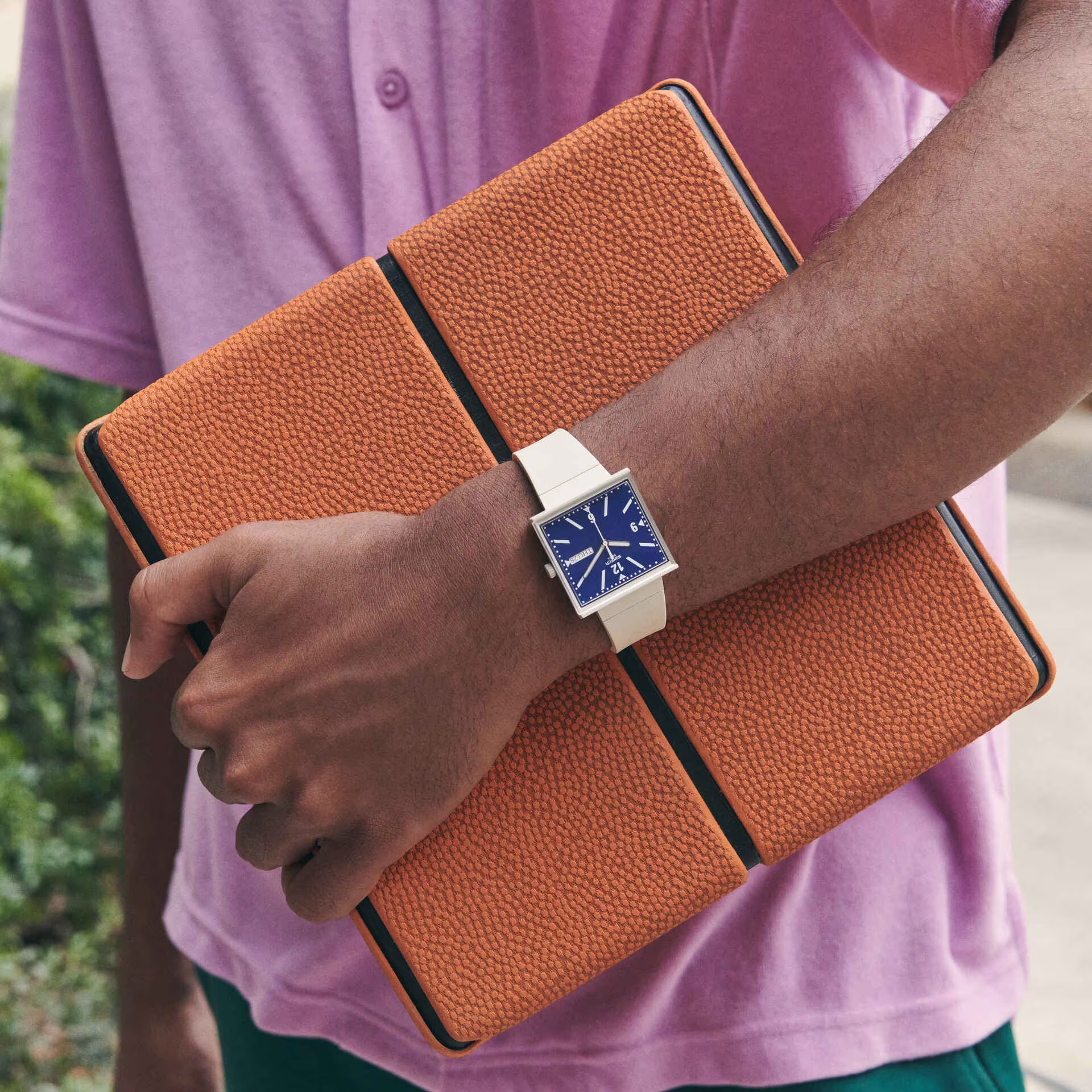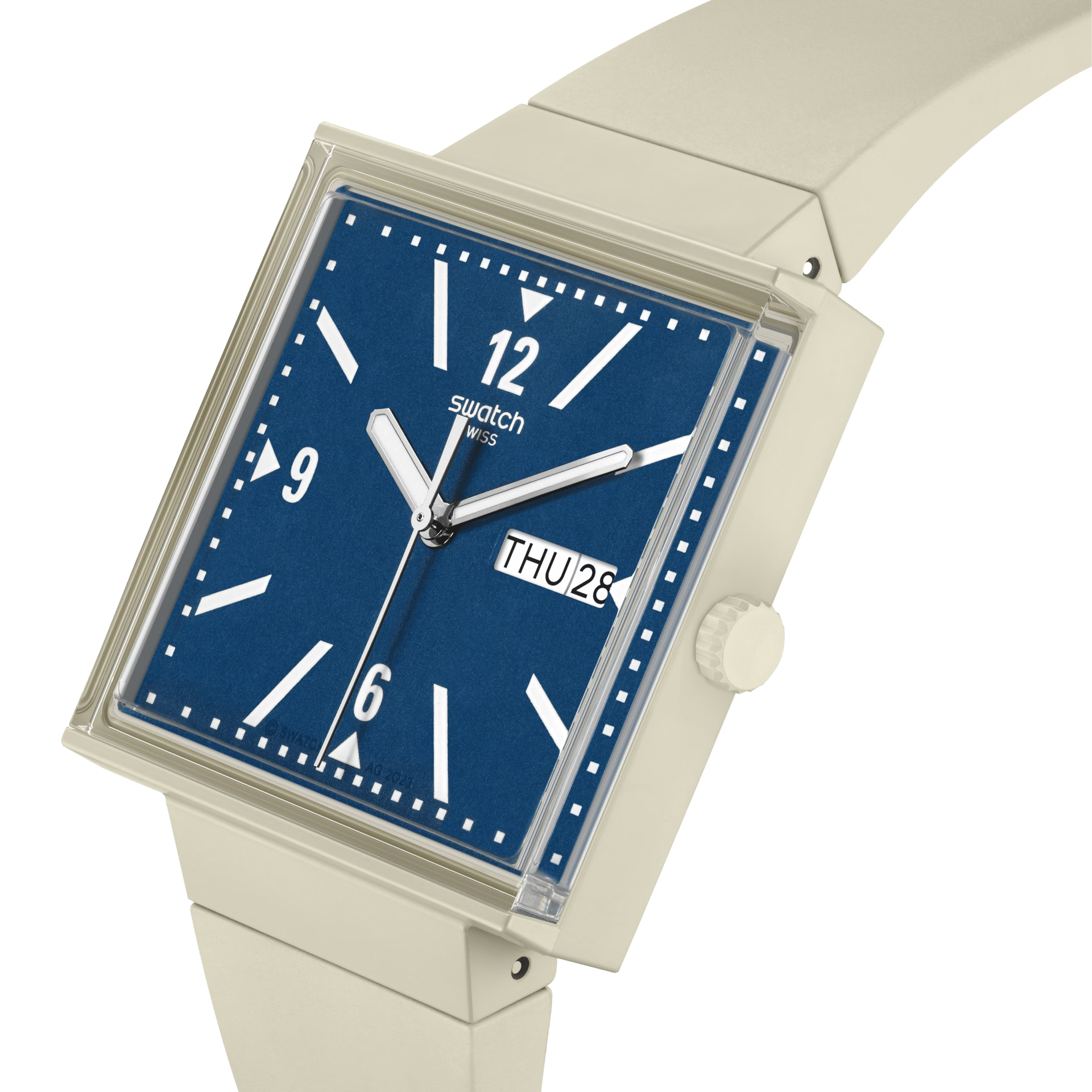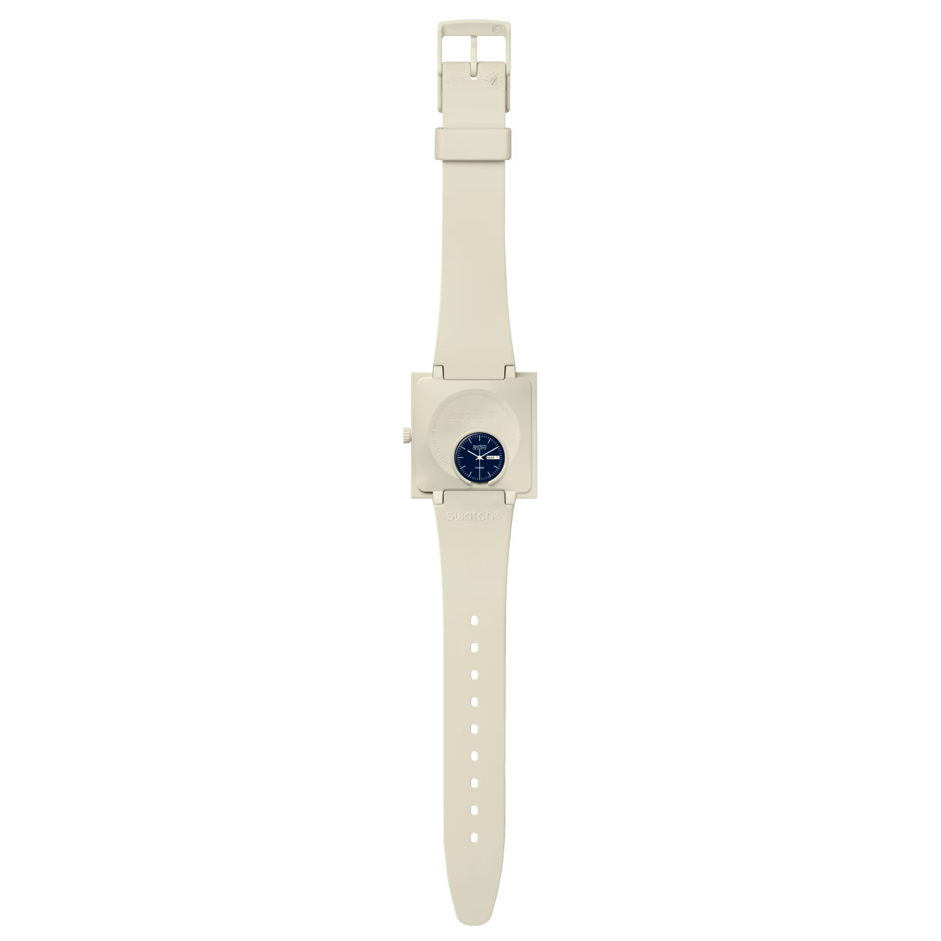 La montre "What If... Beige?" se distingue par son boîtier carré en biocéramique, un matériau innovant offrant à la montre un aspect et une sensation uniques. Son verre bord à bord, également biosourcé, dévoile une vue latérale saisissante des index et des chiffres. Le cadran carré, d'un élégant ton bleu, présente des aiguilles luminescentes pour une lecture aisée dans l'obscurité, ainsi qu'un affichage du jour de la semaine et de la date à 3 heures. Un bracelet intégré, conçu avec un matériau biosourcé, parachève le design moderne de cette montre. Son dos dévoile un couvre-pile illustrant l'un des cadrans inspirant cette création beige carrée au cadran bleu. Étanche jusqu'à 2 bars et équipée d'une boucle, cette montre incarne l'alliance parfaite entre l'esthétique contemporaine et l'innovation durable.