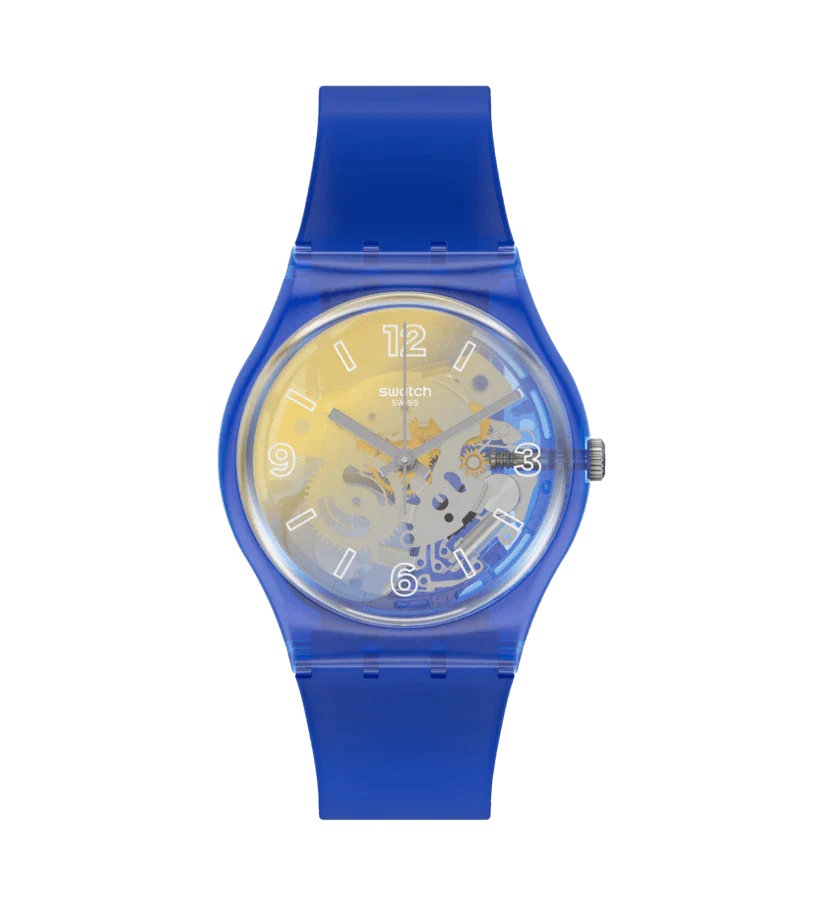 Le bracelet en silicone transparent mat et le boitier en plastique brillant bleus créent un contraste intéressant avec le magnifique dégradé jaune du cadran.